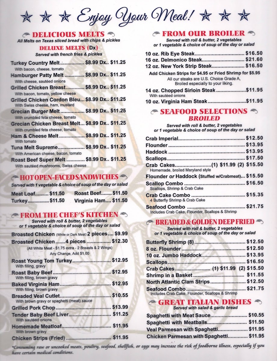 The menu includes traditional breakfast staples like eggs served over easy with home fries and whole wheat toast, alongside crowd-pleasers such as the country omelette and Belgian waffles with bacon. For lunch and dinner, you’ll find a range of satisfying options from a southwest burger with a flavorful boom boom sauce to crab stuffed haddock paired with crispy fries.